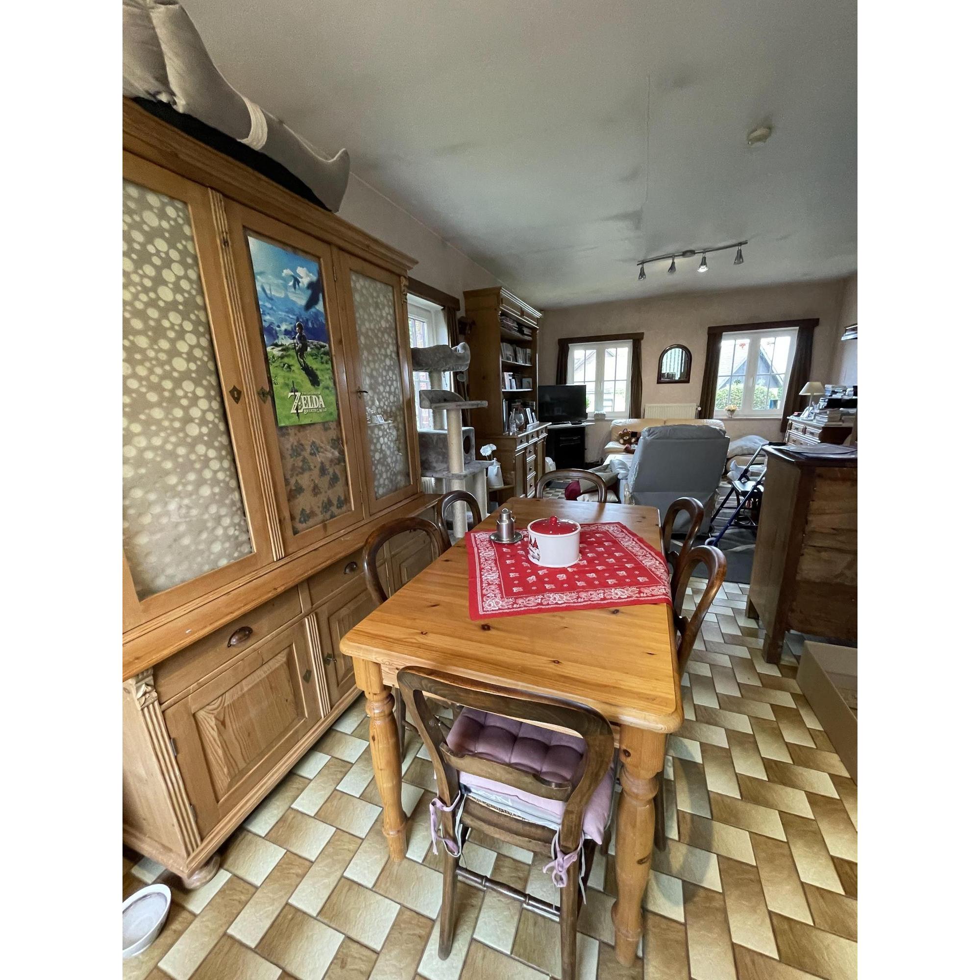 La maison se compose comme suit : entrée, salon et salle à manger (+/- 29 m²), cuisine équipée, hall de nuit, trois chambres à coucher (11,5 ; 10,15 et 8,16 m²), salle de bains, bureau.